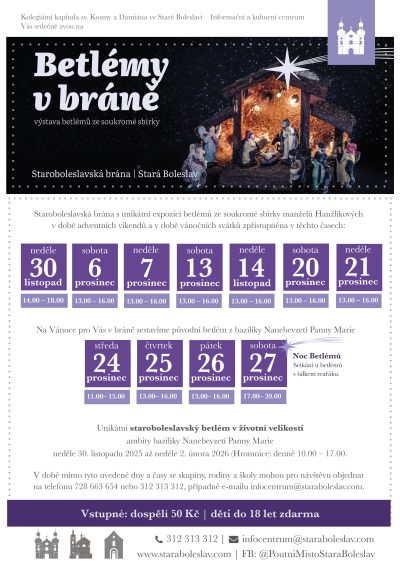 Betlémy v bráně – výstava betlémů ze soukromé sbírky Staroboleslavská brána s unikátní expozicí betlémů ze soukromé sbírky manželů Hanžlíkových je v roce 2025 v době adventních víkendů a v […]