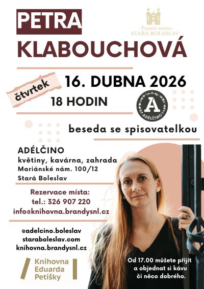 Spisovatelka Petra Klabouchová ve Staré Boleslavi ve čtvrtek 16. dubna 2026 od 18.00 v kavárně Adélčino