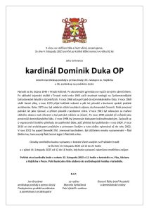 Kardinál Dominik Duka, emeritní arcibiskup pražský, zemřel nad ránem v úterý 4. listopadu 2025. Pražský arcibiskup Mons. Jan Graubner vyzývá k modlitbám a zve věřící pražské arcidiecéze i všechny, kteří měli pana kardinála Duku rádi a vážili si ho k poslednímu rozloučení.